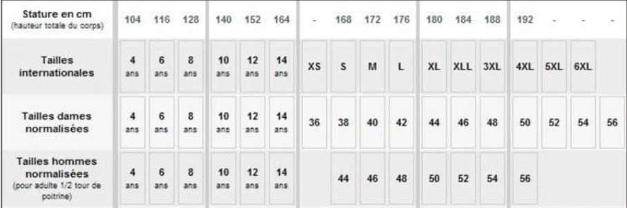 Voici également un guide des tailles (les vestes taillent de manière normale).